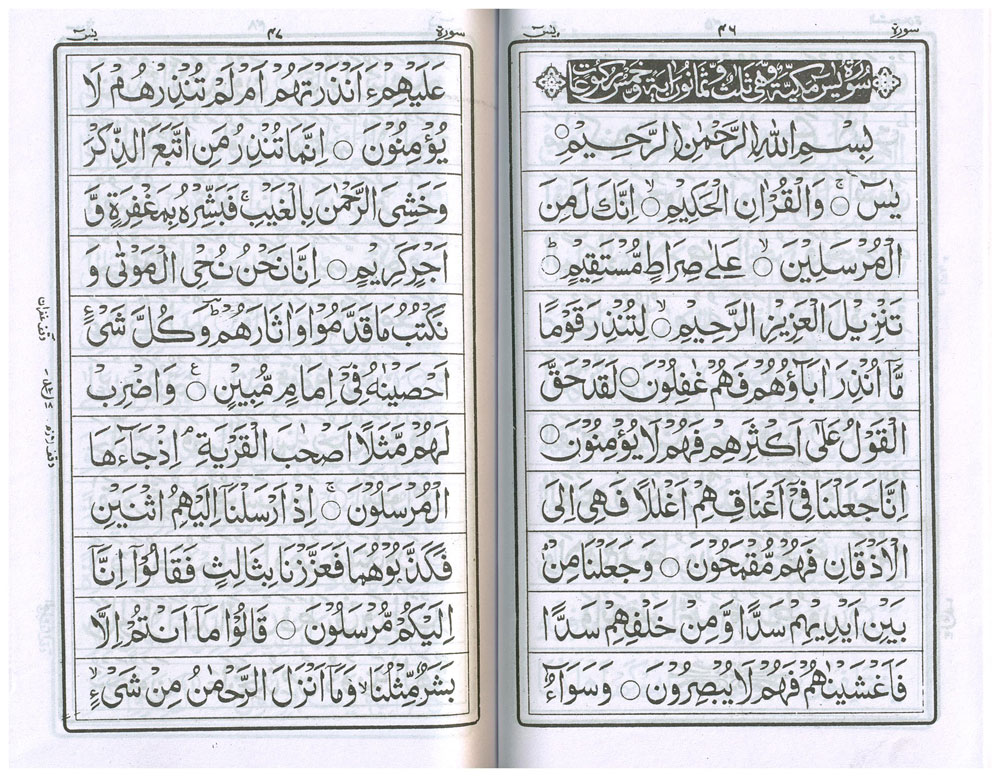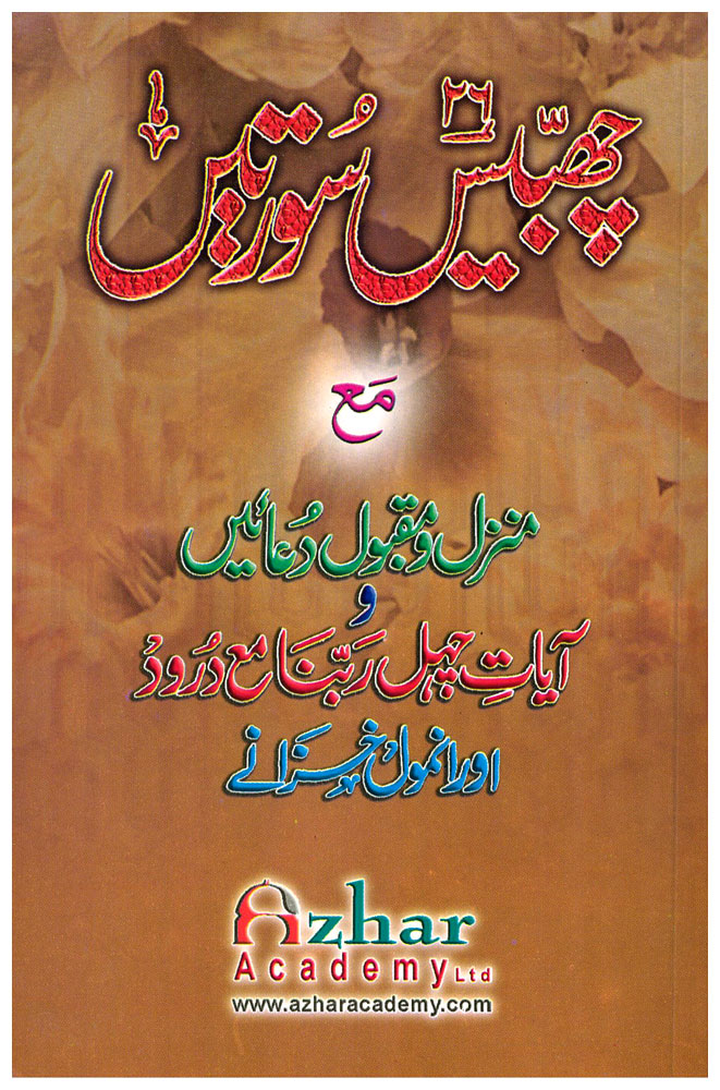 A collection of twenty-six surahs from the Noble Quran. Contains Surahs al-Fatiha, Yasin, al-Fath, ar-Rahman, al-Waqi'ah, al-Mulk, Nuh, al-Jinn, al-Muzzammil, al-Kahf, Maryam, as-Sajdah, ad-Dukhan, Qaf, al-Hadid, al-Hashr, al-Saff, al-Jumu'ah, al-Taghabun, al-Tahrim, al-Qiyamah, al-Dahr, al-Naba, al-A'la, first and last ruku' of Surah al-Baqarah & last ruku' of Surah Aal 'Imran. Also includes Manzil, various duas and duruds, forty Rabbana & Wazifas etc. with Urdu text.