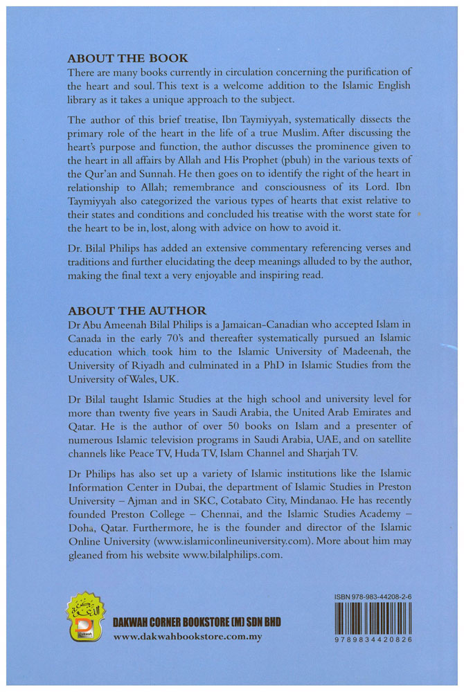 There are many books currently in circulation concerning the purification of the heart and soul. This text is a welcome addition to the Islamic English library as it takes a unique approach to the subject. The author of this brief treatise, Ibn Taymiyyah, systematically dissects the primary role of the heart in the life of the heart in the life of a true Muslim. After discussing the heart’s purpose and function, the author discusses the prominence given to the heart in all affairs by Allah and His Prophet (pbuh) in the various texts of the Qu’ran and Sunnah. He then goes on to identify the right of the heart in relationship to Allah; remembrance and consciousness of its Lord. Ibn Taymiyyah also categorized the various types of hearts that exist relative to their states and conditions and concluded his treatise with the worst state for the heart to be in, lost, along with advice on how to avoid it. Dr. Bilal Philips has added an extensive commentary referencing verses and traditions and further elucidating the deep meanings alluded to by the author, making the final text a very enjoyable and inspiring read.