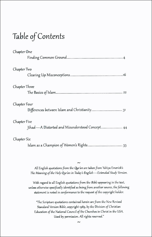 Finally, the last two chapters deal with hot potato topics. For example, the FIFTH chapter looks at the Islamic concept of Jihad and how that concept has been misunderstood and distorted by some so-called Muslims. The SIXTH chapter examines and clarifies the role of women in Islam and presents the evidence supporting the proposition that Islam is actually a champion of women s rights.