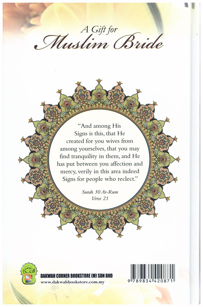 This book, truthfully, is an ideal gift to Muslim brides, as mainly deals with the concerned affairs of newly married life e.g., How to live amicably with in-laws avoiding all domestic disputes and how to harmonise with the Husband's sentiments and preferences, to capture his heart and inclusive attention. Etc. etc.