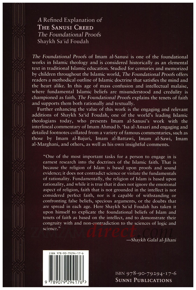 The Foundational Proofs of Imam al-Sanusi is one of the foundational works in Islamic theology and is considered historically as an elemental text in traditional Islamic education. Studied for centuries and memorized by children throughout the Islamic world, The Foundational Proofs offers readers a methodical outline of Islamic doctrine that satisfies the mind and the heart alike. In this age of mass confusion and intellectual malaise, where fundamental Islamic beliefs are misunderstood and credulity is championed as faith, The Foundational Proofs explains the tenets of faith and supports them both rationally and textually.