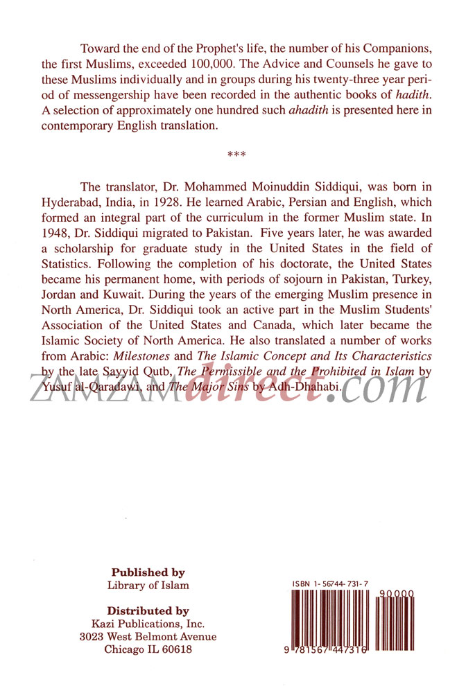 Towards the end of the Prophet's life, the number of his Companions, the first Muslims, exceeded 100,000. The Advice and Counsels he gave to these Muslims individually and in groups during his twenty-three year period of messenger ship have been recorded in authentic books of hadith. A selection of approximately one hundred such ahadith is presented here in contemporary English.