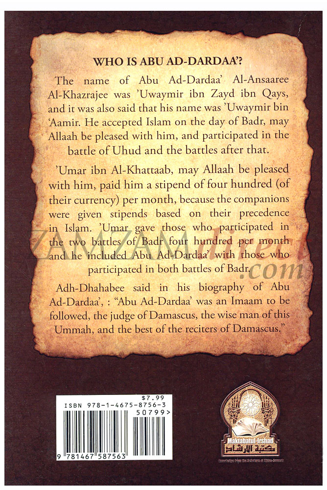 The name Abu Ad-Dardaa Al-Ansaaree Al-Khazrajee was Uwaymir ibn Zayd ibn Qays, and it was also said that his name was ‘Uwaymir bin Aamir. He accepted Islam on the day of Badr, may Allah be pleased with him, and participated in the battle of Uhad and the battles after that.