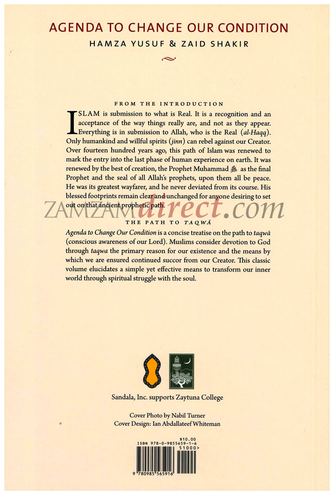 In this updated for 2008 new edition of "Agenda to Change Our Condition," Shaykh Hamza Yusuf chalks out a program for all Muslims who want to rectify their current state of apathy and heedlessness of Allah's commands. The book includes sections on Practical Steps to Change Our Condition, Taqwa: Its Definition and its Benefits, The Heart and its Treatment (by Qadi Abu Bakr ibn al-`Arabi), culminating with a series of exercises on how to attain taqwa.