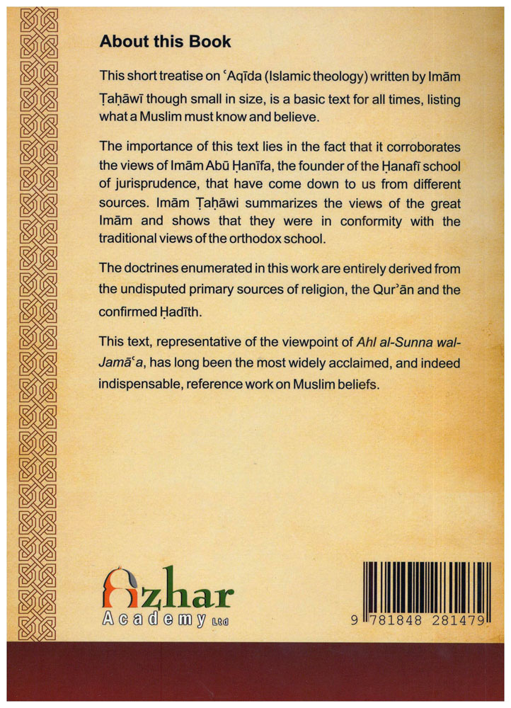 Author: Imam Abu Ja'far Ahmed Ibn Muhammad Ibn Salama Al-Azadi Al-Tahawi Translator: Mawlana Fahim Hoosen Publisher: Azhar Academy Ltd ISBN : 9781848281479 Language : English -Binding: Paperback -