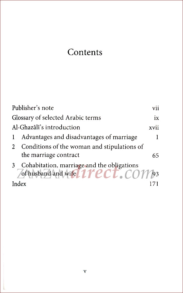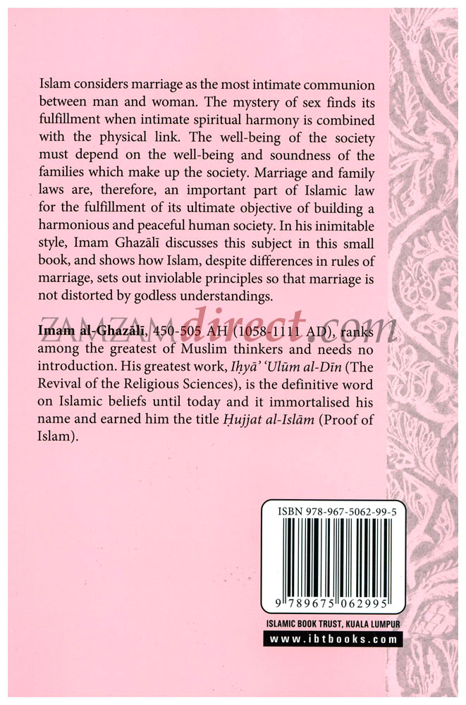 Islam considers marriage as the most intimate communion between man and woman. The mystery of sex finds it fulfillment when intimate spiritual harmony is combined with the physical link. The well being of the society must depend on the well-being and soundness of the families which make up the society. Marriage and family laws are, therefore, an important part of Islamic Law for the fulfillment of its ultimate objective of building a harmonious and peaceful human society. In his inimitable style, Imam Ghazali discusses this subject in this small book, and shows how Islam, despite differences in rules of marriage, set out inviolable principles so that marriage is not distorted by godless understandings.