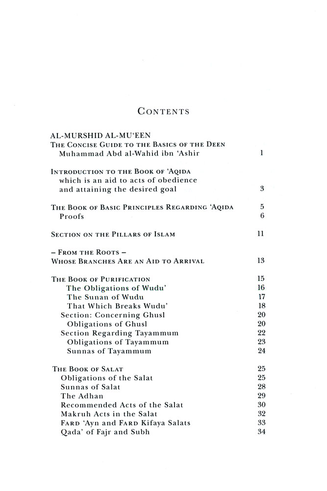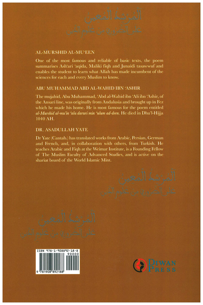 Al-Murshid al-Mu‘een is a widely recognized primary text for learning Islam in North Africa. In it the author, Abd al-Wahid ibn 'Ashir, summarizes in verse the three sciences of Islam, Iman and Ihsan: Maliki fiqh, Ash'ari 'aqida and Junaidi tasawwuf. This is its first easily available complete translation into English after the Guiding Helper Foundation’s online edition.