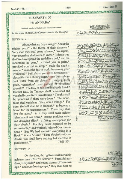 There are no footnotes to refer and no commentary or lengthy explanations to read. All necessary explanations have been incorporated right there in the text with italic type setting to differentiate from the translation of the meanings of Qur’anic Arabic Text.