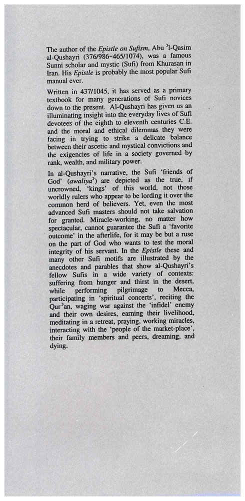 Written in 437/1045, Al-Qushayri’s Epistle on Sufism has served as a primary textbook for many generations of Sufi novices down to the present. It gives us an illuminating insight into the everyday lives of Sufi devotees of the eighth-eleventh centuries C.E. and the moral and ethical dilemmas they were facing in trying to strike a delicate balance between their ascetic and mystical convictions and the exigencies of life in a society governed by rank, wealth, and military power.