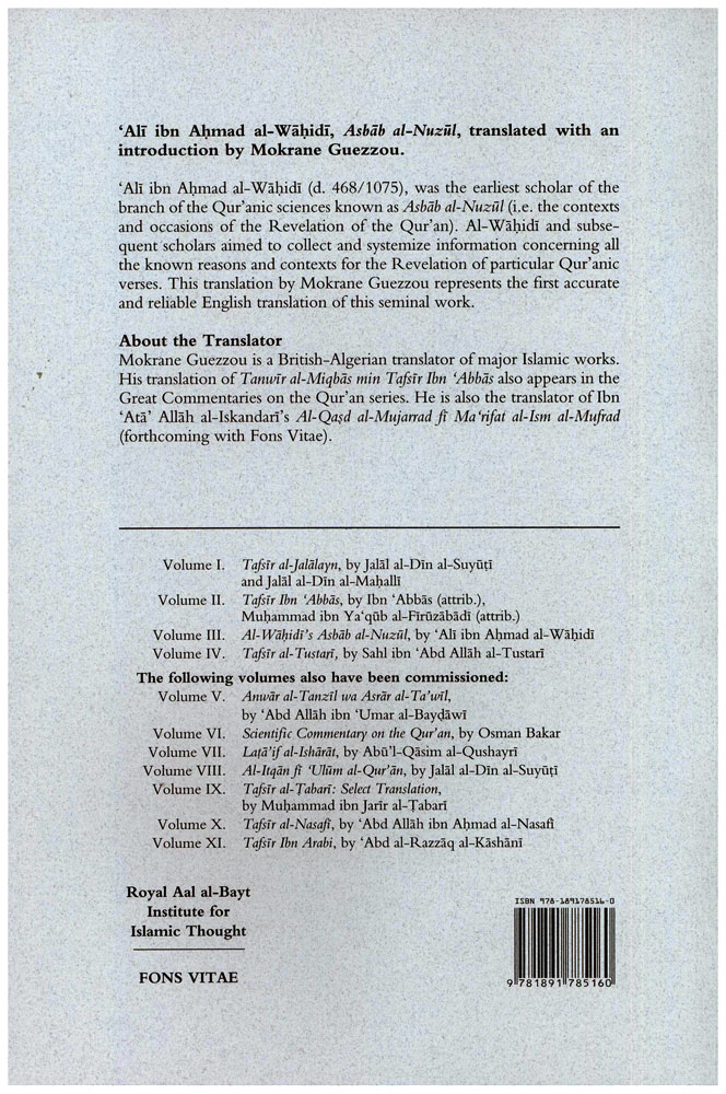 Up until now, the fundamental texts of the Islamic faith, apart from the notable exception of the Hadith of the Prophet, have remained out of reach of many Muslims and non-Muslims alike. Among the most important sources for understanding the Qur'an are the tafsir works, commentaries on the Qur'an, which help to properly explain and contextualise the Revelation. Al-Wahidi's Asbab Al-Nuzul, presented here in complete English translation for the first time ever, is the third work in The Great Commentaries on the Holy Qur'an series. The series aims to make widely available leading exegetical works in translation for study and research in unabridged form, which are faithful to the letter and meaning of the Arabic.