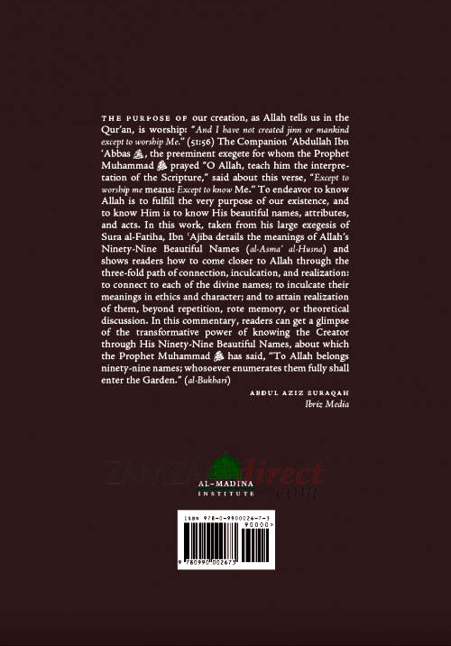 The purpose of our creation, as Allah tells us in the Qur'an, is worship: "And I have not created jinn or mankind except to worship Me." (51:56) The Companion 'Abdullah Ibn 'Abbas , the preeminent exegete for whom the Prophet Muhammad s prayed "O Allah, teach him the interpretation of the Scripture," said about this verse, "Except to worship me means: Except to know Me." To endeavor to know Allah is to fulfill the very purpose of our existence, and to know Him is to know His beautiful names, attributes, and acts. In this work, taken from his large exegesis of Sura al-Fatiha, Ibn ¢Ajiba details the meanings of Allah's Ninety-Nine Beautiful Names (al-Asma' al-Husna) and shows readers how to come closer to Allah through the three-fold path of connection, inculcation, and realization: to connect to each of the divine names; to inculcate their meanings in ethics and character; and to attain realization of them, beyond repetition, rote memory, or theoretical discussion. In this commentary, readers can get a glimpse of the transformative power of knowing the Creator through His Ninety-Nine Beautiful Names, about which the Prophet Muhammad s has said, "To Allah belongs ninety-nine names; whosoever enumerates them fully shall enter the Garden." (al-Bukhari)