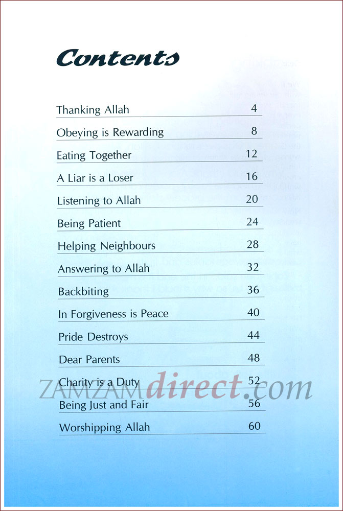 Every Little Talk in this book includes some questions to make children think, especially about their own behavior in context of the virtue discussed in that Talk. Each Talk ends with some Quranic verses and Hadith quotes to stress and highlight the Islamic teaching discussed in that Talk.