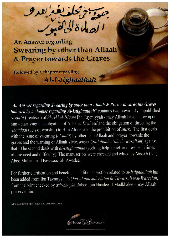 This book contains two previously unpublished rasaa'il (treatises) of Shaykhul-Islaam Ibn Taymiyyah - may Allaah have mercy upon him - clarifying the obligation of Allaah's Tawheed and the obligation of directing the 'ibaadaat (acts of worship) to Him Alone, and the prohibition of shirk. The first deals with issue of swearing (al-halif) by other than Allaah and prayer towards the graves and the warning of Allaah's Messenger (Sallallaahu 'alayhi wasallam) against that. The second deals with al-Istighaathah (seeking help, relief, and rescue in times of dire need and difficulty).