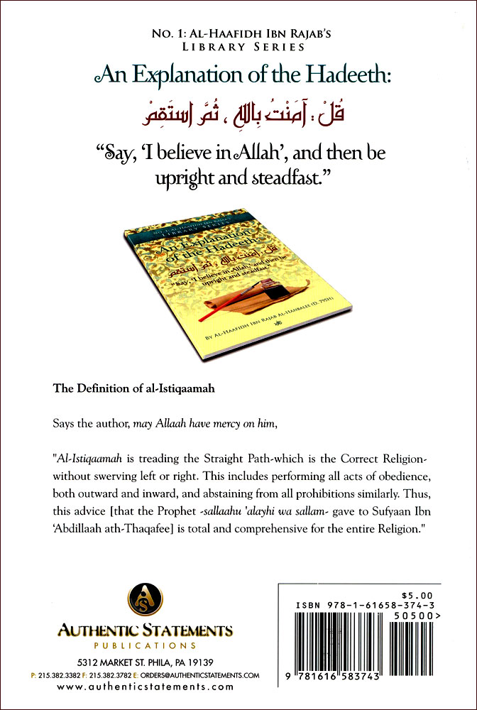 Al-Istiqaamah is treading the straight path-which is the correct religion without swerving left or right. This includes performing all acts of obedience, both outward and inward , and abstaining from all prohibitions similarly.