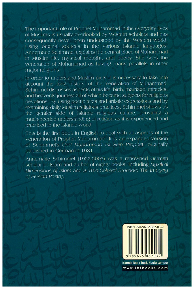 The important role of the Prophet Muhammad in the everyday lives of Muslims is usually overlooked by Western scholars and has consequently never been understood by the Western world. Using original sources in the various Islamic languages, Annemarie Schimmel explains the central place of Muhammad in Muslim life, mystical thought, and poetry. She sees the veneration of Muhammad as having many parallels in other major religions.