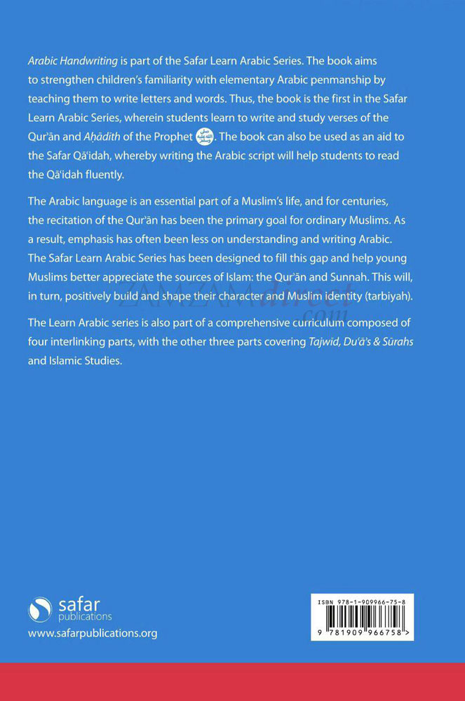 Arabic Handwriting is part of the Safar Learn Arabic Series. The aim of the book is to strengthen children’s familiarity with elementary Arabic penmanship by teaching them to write letters and words. This is the first book in the Safar Learn Arabic Series, wherein students learn to write and study verses of the Qurʾān and Aḥādīth of the Prophet صلى الله عليه وسلم. The book can also be used as an aid to the Safar Qāʿidah, whereby writing the Arabic script will aid students to learn and read the Qāʿidah fluently.