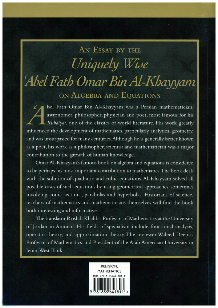 Author: Omar Al-Khayyam Translator: Roshdi Khalil Publisher: Garnet Publishing Ltd. Size/Vol.: none ISBN : 9781859641811 Language : English -Binding: Paperback -