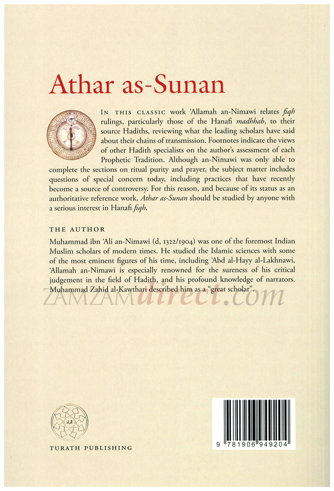 In this classic work Allamah an-Nimawi relates fiqh rulings, particularly those of the Hanafi madhhab, to their source Hadiths, reviewing what the leading scholars have said about their chains of transmission. Footnotes indicate the views of other Hadith specialists on the authors assessment of each Prophetic Tradition. Although an-Nimawi was only able to complete the sections on ritual purity and prayer, the subject matter includes questions of special concern today, including practices that have recently become a source of controversy. For this reason, and because of its status as an authoritative reference work, Athar as-Sunan should be studied by anyone with a serious interest in Hanafi fiqh.