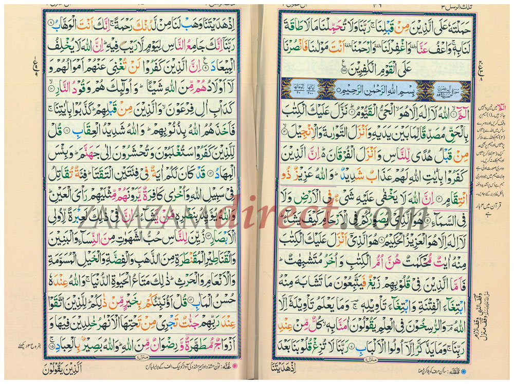 Glossy pages with color coded tajweed rules and colour coded manzils -