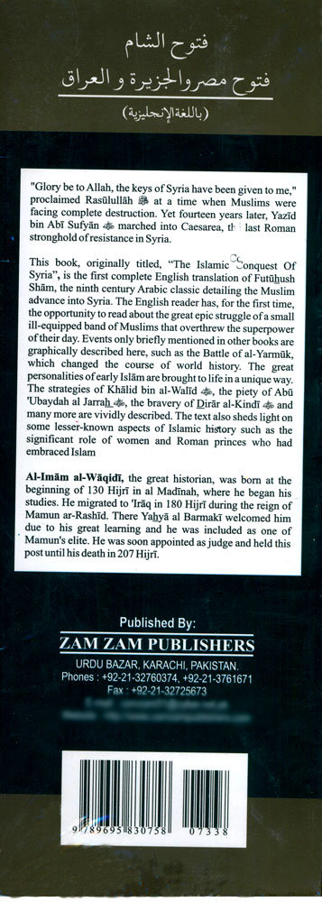 English translation of Futuh al-Sham, the inspiring history of the Sahabah's conquest of ash-Sham (which today includes Syria, Lebanon, Palestine Jordan, and other parts of Arabia, Iraq and Turkey) as narrated by the great historian al-Imam al-Waqidi. Events only briefly mentioned in other works are dealt with in detail here. The strategies of Khalid ibn al-Walid, the piety of Abu Ubaydah ibn al-Jarrah, the bravery of Dirar al-Kindi and many more are vividly described. This work also sheds light on lesser known aspects of Islamic history such as the significant role of women and Roman princes who embraced Islam.