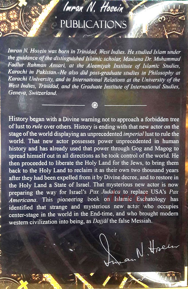 History began with a Divine warning not to approach a forbidden tree of lust to rule over others. History is ending with that new actor on the stage of the world displaying an unprecedented imperial lust to rule the world. That new actor possesses power unprecedented in human history and has already used that power through Gog and Magog to spread himself out in all directions as he took control of the world. He then proceeded to liberate the Holy Land for the Jews, to bring them back to the Holy Land to reclaim it as their own two thousand years after they had been expelled from it by Divine decree, and to restore in the Holy Land a State of Israel. That mysterious new actor is now preparing the way for Israel’s Pax Judaica to replace USA’s Pax Americana. This pioneering book on Islamic Eschatology has identified that strange and mysterious new actor who occupies center-stage in the world in the End-time, and who brought modern western civilization into being, as Dajjāl the false Messiah.