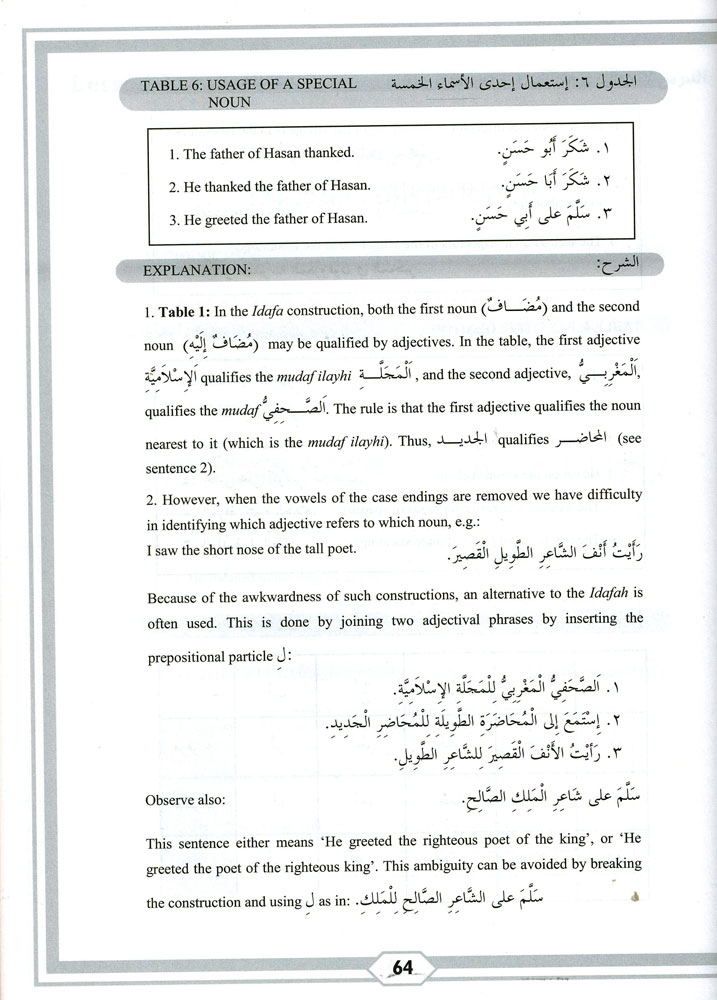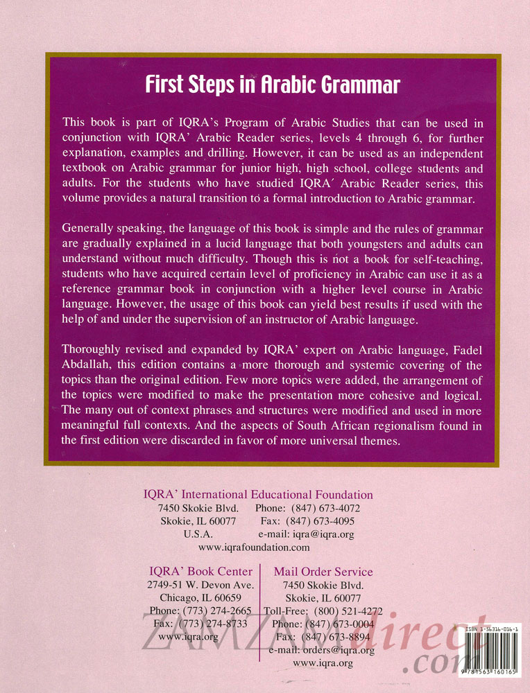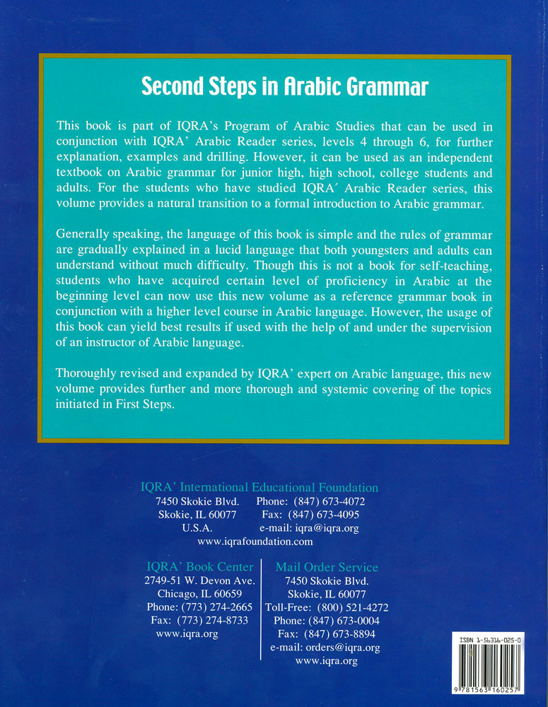 This book is part of IQRA's Program of Arabic Studies that can be used in conjunction with IQRA' Arabic Reader series, levels 4 through 6, for further explanation, examples and drilling. However, it can be used as an independent textbook on Arabic grammar for junior high, high school, college students and adults. For the students who have studied IQRA' Arabic Reader series, this volume provides a natural transition to a formal introduction to Arabic grammar. Generally speaking, the language of this book is simple and the rules of grammar are gradually explained in a lucid language and explained the rules of Arabic grammar for junior and senior level students as well as for adults. Each lesson is well planned, explaining one simple rule of grammar and providing explanation for the rules, examples, new vocabulary and various exercises that both youngsters and adults can understand without much difficulty.