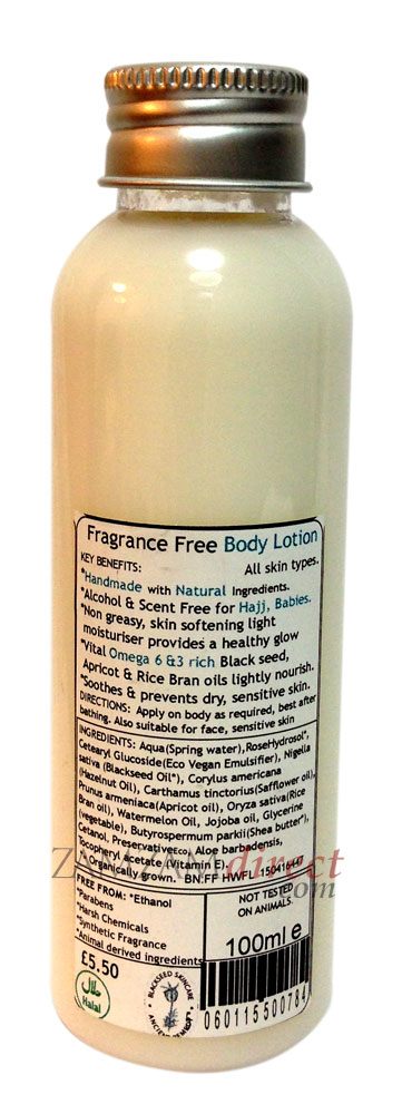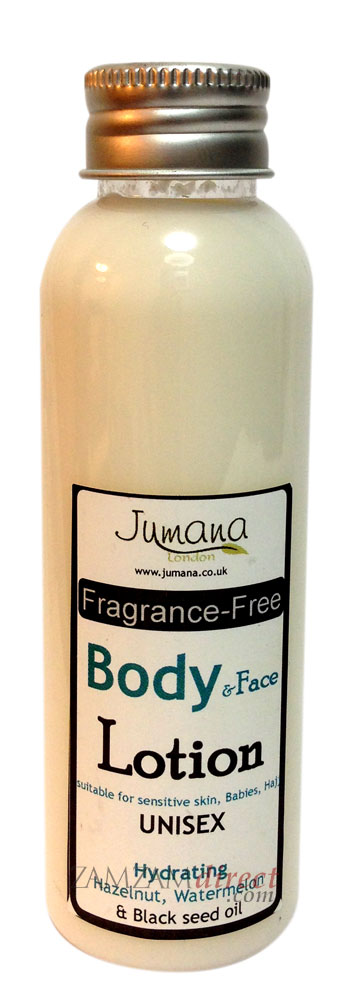 Brand: Jumana Size/Vol.: 100ml -Key Benefits:- * Handmade wtih natural ingredients.- * Alcohol & Scent free for Hajj, Babies.- * Non greasy & skin softening light moisturiser provides a healthy glow- * vital omega 6 & 3 rich blackseed, Almond & Olive oils lightly nourish skin- * Prevents & soothes dry, sensitive skin.- Ingredients:- Aqua (Spring water), Cetearyl Glucoside (Eco Vegan Emulsifier), Nigella sativa (blackseed oil), Prunus amygdalus (Almond oil), Olea europaea (Olive oil), Carthamus tinctorius (safflower oil), Jojoba oil, Butyrospermum parldi (Shea Butter), Glycerine (vegetable), Cetanol PreservativeEco, Laoe barbadensis, Tocopheryl acetate(Vitamin E), Organically grown