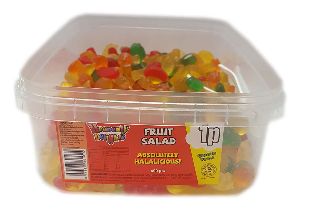 Fruit Salad Sweets [Tub of 600 pcs, 1p Range] Traditiional fruit flavoured, deliciously soft jelly sweets in your favourite fruit shapes. � Gluten Free � Halal HMC Certified