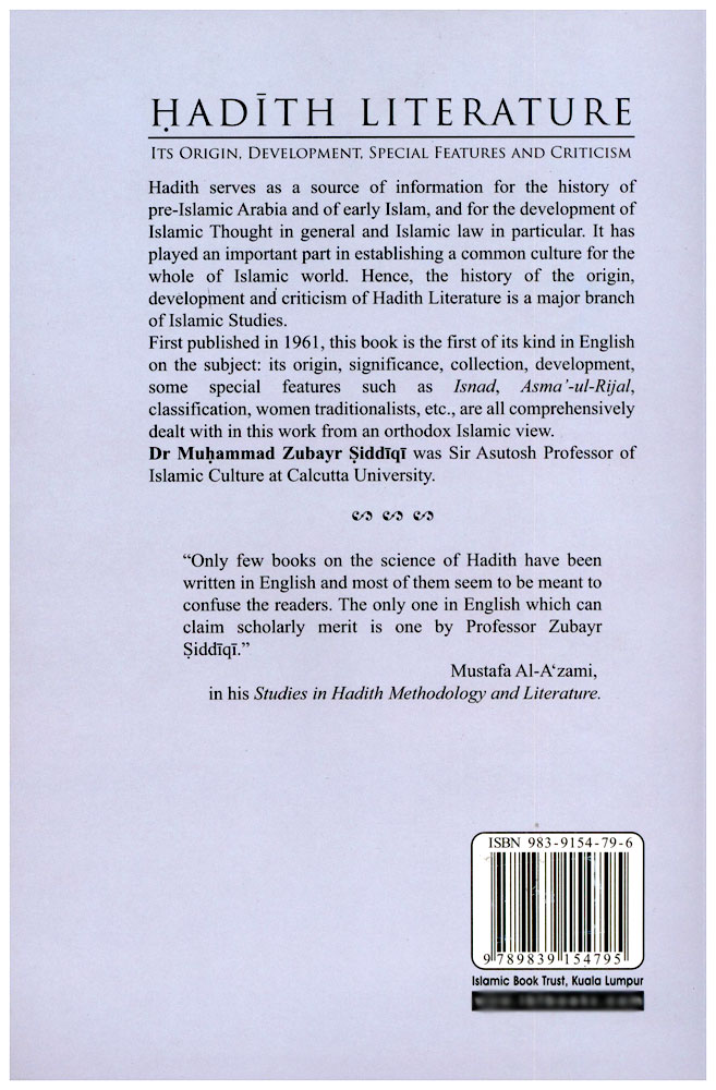 Author: Muhammad Zubayer Siddiqi Publisher: Islamic Book Trust - IBT Size/Vol.: A5_EXTRA (17.3x23.5 cm - 6.81x9.25 in) ISBN : 9839154796 Language : English -A5 Size (Large) - 23 x 16 x 1.5 CM -