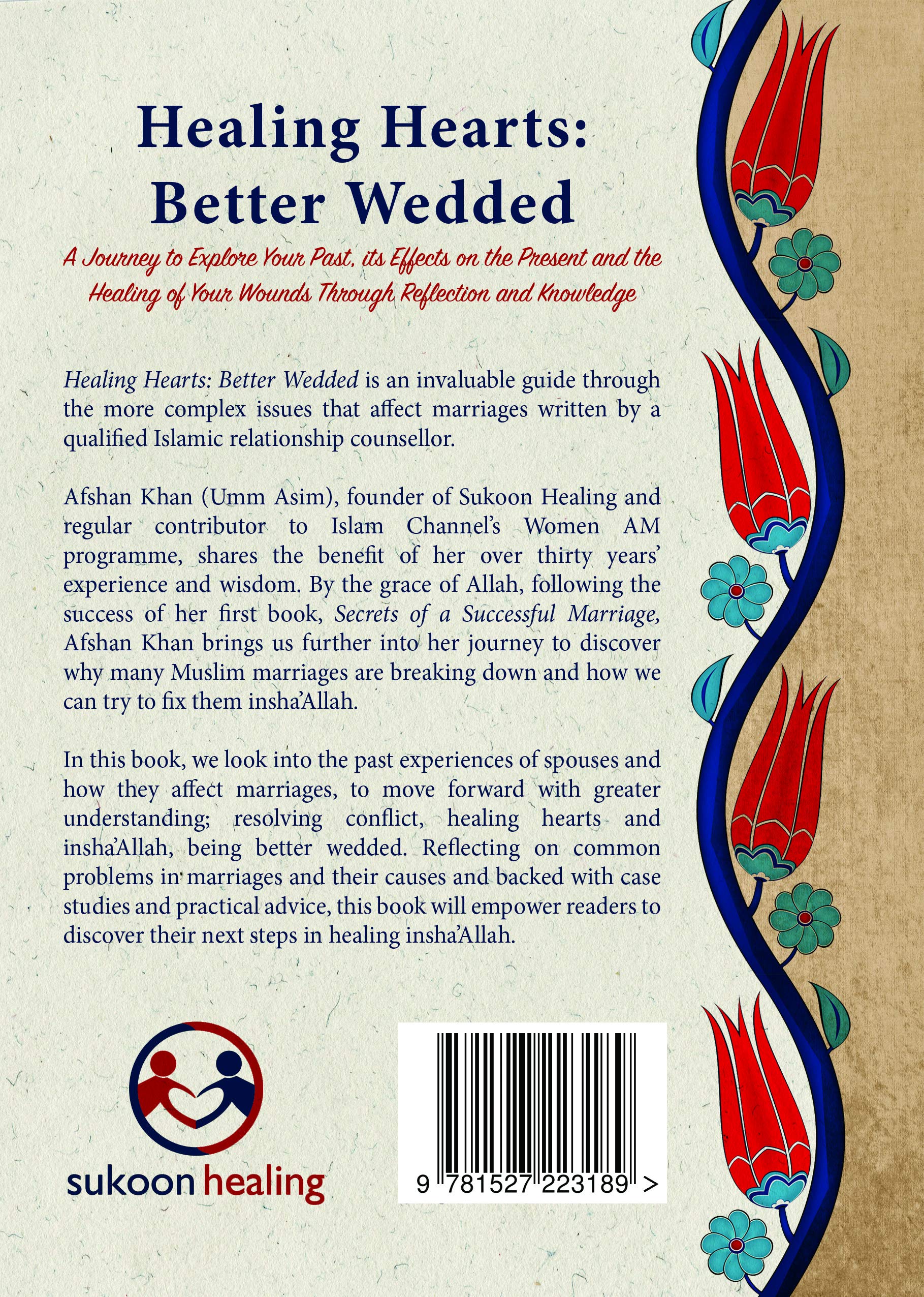 Author: Afshan Khan Publisher: Sukoon Healing Size/Vol.: A5 (14.8x21 cm - 5.83x8.27 in) Paperback ISBN : 9781527223189 Language : English -Healing Hearts: Better Wedded is an invaluable guide through the more complex issues that affect marriages written by a qualified and experienced Islamic relationship counsellor. Afshan Khan(umm Asim),founder of Sukoon healing and regular contributor to Islam Channel's Women AM programme, shares the benefit of her over thirty years experience and wisdom. Following the success of her first book, "Secrets of a Successful Marriage", Afshan Khan brings us further into her journey to discover why many Muslim marriages are breaking down and how we can try to fix them insha'Allah. In this second book, we look into the past experiences of spouses and how these experiences affect marriages, to move forward with greater understanding; resolving conflict, healing hearts and insha'Allah, being better wedded. This highly topical book offers advice on how to deal with issues such as narcissism, depression, emotional distance in marriages, addictions and their causes, domestic violence, bullying and abuse amongst others. The author does not shy away from confronting these problems - problems that we as a Muslim community often ignore, deny or dismiss, but that we must discuss and deal with, treating those who suffer with compassion and understanding.