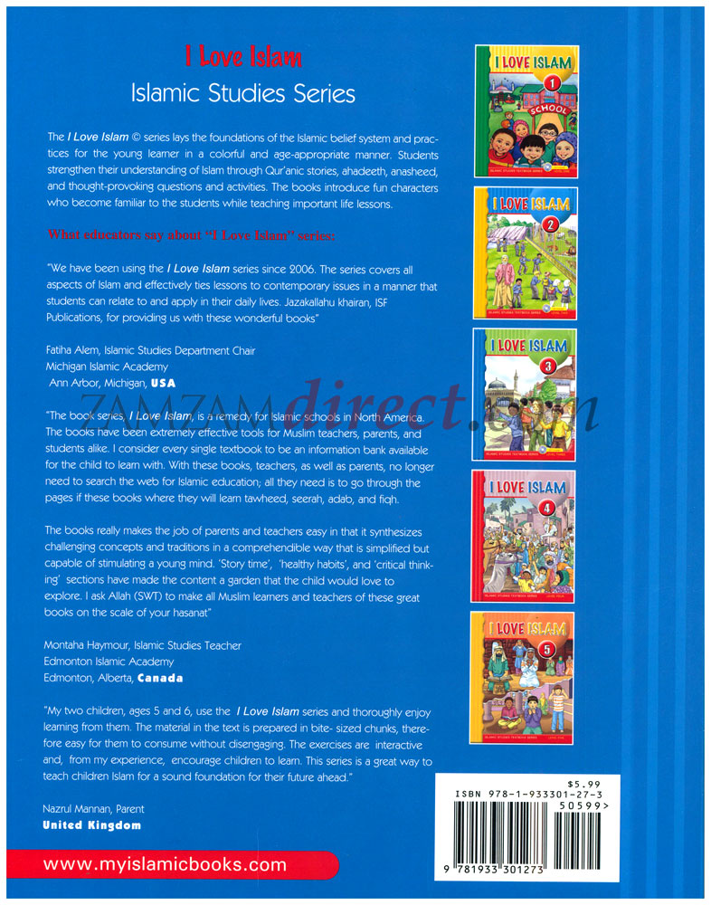 I love Islam” series aims to present Islam to primary grades Muslim students in an exciting and creative manner. Textbooks and workbooks are gradually aim to introduce Muslim students to the essentials of their faith and bring to light historic and cultural aspects of Islam. Each book of the series is designed to emphasize the aspects of Islam which are appropriate for the grade level. The series cover grades one through twelve and include a student textbook and workbook, as well as a teacher's edition. This program by design introduces Islam to young Muslims through authentic and state of the art educational and Islamic tarbiyah methodologies. A workbook accompanies the Level One textbook in order to enhance comprehension and reinforce learning. It contains fun activities, quizzes, puzzles and word searches. Noorart, in conjunction with Islamic Services Foundation, is pleased to offer three companion CDs with the textbooks. Each textbook contains one CD with selections from the following audio products: