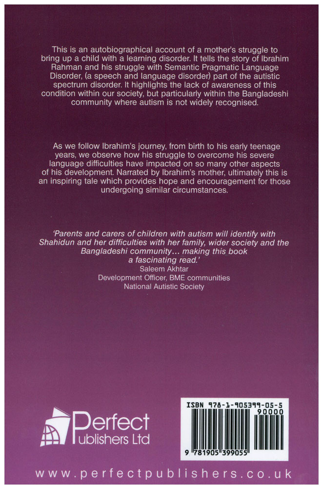 This is an autobiographical account of a mother's struggle to bring up a child with a learning disorder. It tells the story of Ibrahim Rahman and his struggle with a speech and language disorder, part of the autistic spectrum disorder. It highlights the lack of awareness of this condition within our society, but particularly within the Bangladeshi community where autism is not recognised.