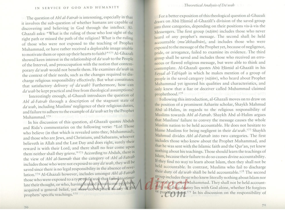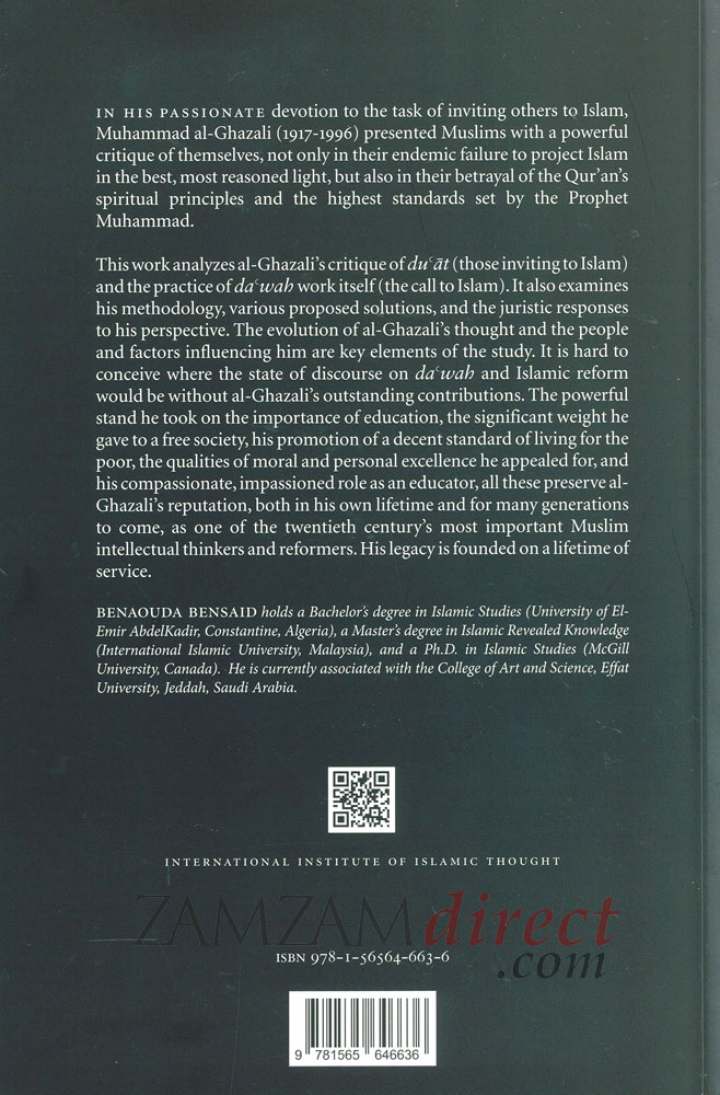 In his passionate devotion to the task of inviting others to Islam, Muhammad al-Ghazali (1917-1996) presented Muslims with a powerful critique of themselves, not only in their endemic failure to project Islam in the best, most reasoned light, but also in their betrayal of the Qurans spiritual principles and the highest standards set by the Prophet Muhammad. This work analyzes al Ghazalis critique of duat (those inviting to Islam) and the practice of dawah work itself (the call to Islam). It also examines his methodology, various proposed solutions, and the juristic responses to his perspective. The evolution of al Ghazalis thought and the people and factors influencing him are key elements of the study. It is hard to conceive where the state of discourse on dawah and Islamic reform would be without al-Ghazalis outstanding contributions. The powerful stand he took on the importance of education, the significant weight he gave to a free society, his promotion of a decent standard of living for the poor, the qualities of moral and personal excellence he appealed for, and his compassionate, impassioned role as an educator, all these preserve al-Ghazalis reputation, both in his own lifetime and for many generations to come, as one of the twentieth centurys most important Muslim intellectual thinkers and reformers. His legacy is founded on a lifetime of service.