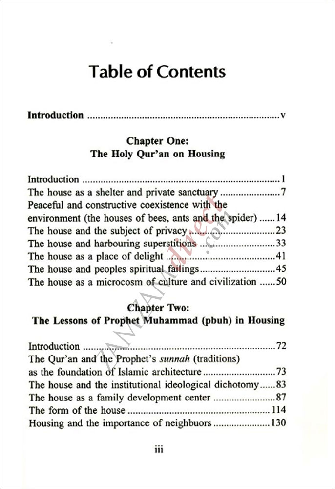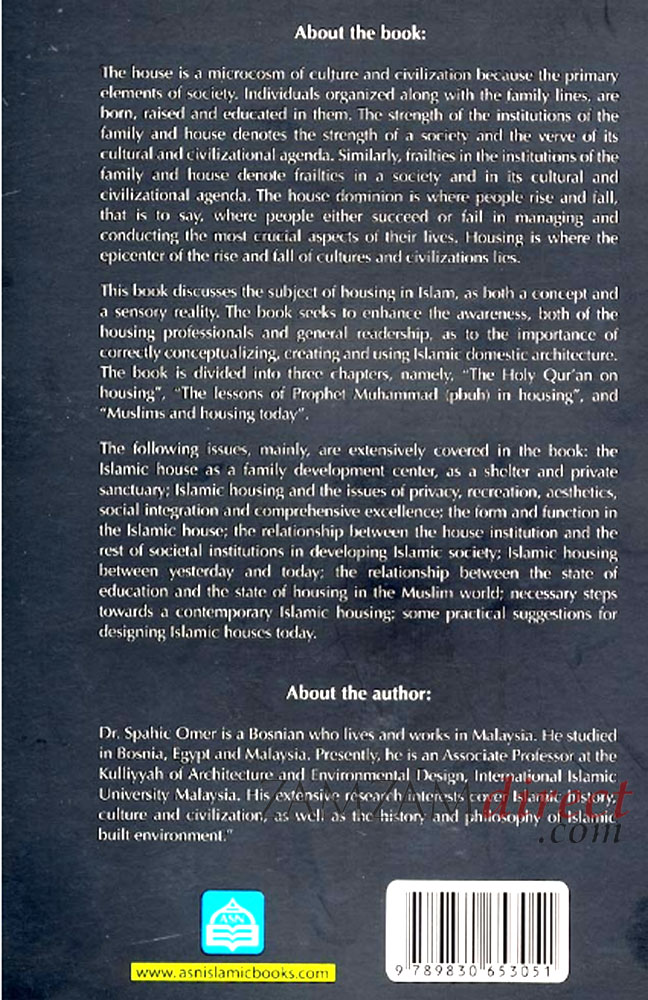 The house is a microcosm of culture and civilization because the primary elements of society, individuals organized along with the family lines, are born, raised and educated in them. The strength of the institutions of the family and house denotes the strength of a society and the verve of its cultural and civilizational agenda. Similarly, frailties in the institutions of the family and house denote frailties in a society and in its cultural and civilizational agenda. The house dominion is where people rise and fall, that is to say, where people either succeed or fail in managing and conducting the most crucial aspects of their lives. Housing is where the epicenter of the rise and fall of cultures and civilizations lies. This book discusses the subject of housing in Islam, as both a concept and a sensory reality. The book seeks to enhance the awareness, both of the housing professionals and general readership, as to the importance of correctly conceptualizing, creating and using Islamic domestic architecture. The book is divided into three chapters, namely, “The Holy Qur’an on housing”, “The lessons of Prophet Muhammad (pbuh) in housing”, and “Muslims and housing today”. The following issues, mainly, are extensively covered in the book: the Islamic house as a family development center; the Islamic house as a shelter and private sanctuary; Islamic housing and the issues of privacy, recreation, aesthetics, social integration and comprehensive excellence the form and function in the Islamic house; the relationship between the house institution and the rest of societal institutions in developing Islamic society Islamic housing between yesterday and today the relationship between the state of education and the state of housing in the Muslim world; necessary steps towards a contemporary Islamic housin; some practical suggestions for designing Islamic houses today.
