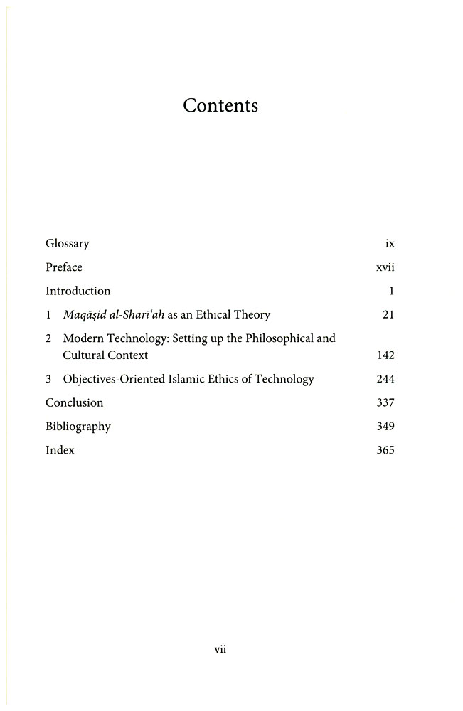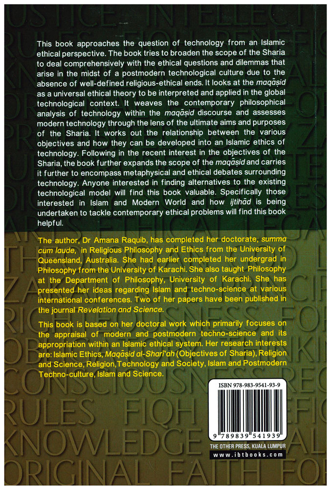 "This book approaches the question of technology from an Islamic ethical perspective. The book tries to broaden the scope of the Sharia to deal comprehensively with the ethical questions and dilemmas that arise in the midst of a postmodern technological culture due to the absence of well-defined religious-ethical ends. It looks at the maqasid as a universal ethical theory to be interpreted and applied in the global technological context. It weaves the contemporary philosophical analysis of technology within the maqasid discourse and assesses modern technology through the lens of the ultimate aims and purposes of the Sharia. It works out the relationship between the various objectives and how they can be developed into an Islamic ethics of technology. Following in the recent interest in the objectives of the Sharia, the book further expands the scope of the maqasid and carries it further to encompass metaphysical and ethical debates surrounding technology. Anyone interested in finding alternatives to the existing technological model will find this book valuable. Specifically those interested in Islam and Modern World and how ijtihad is being undertaken to tackle contemporary ethical problems will find this book helpful."