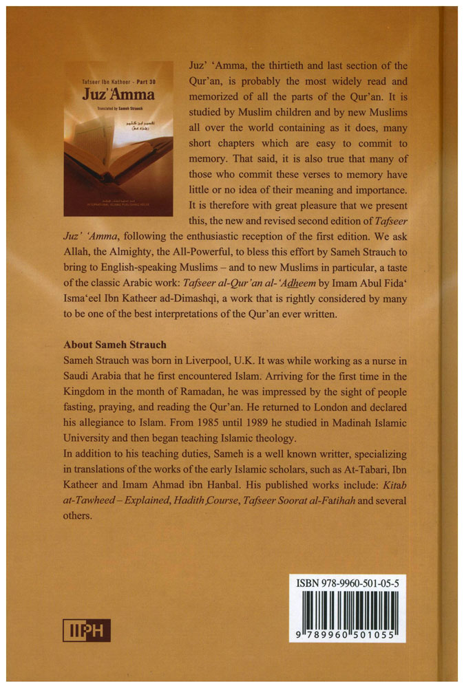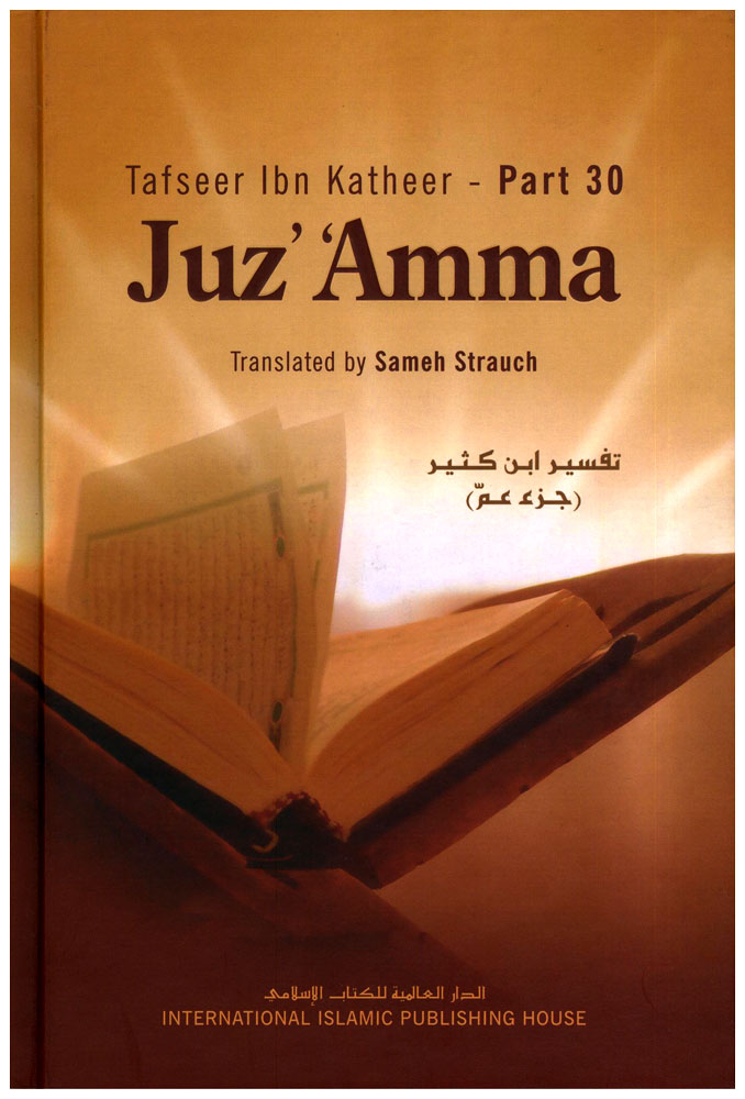 The 30th part of Tafsir Ibn Kathir is comprehensive in interpretation. The meanings of the Qur'an have been interpreted by the Qur'an itself or by the traditions of the Prophet(S) and are enlightened with the thoughts and perception of the Salaf Saliheen; this is the cause that this renowned commentary is famous and favorite towards understanding the Noble Qur'an. The phrase juz amma' refers to the last 30th of the Qur'an, comprising suras 78-114. It is common for more casual students of Islam to memorize this final juz of the Qur'an, as opposed to becoming a complete hafiz. 78. Sura Naba (The Great News) 79. Sura Nazi'at ( Those Who tear Out ) 80. Sura 'Abasa (He Frowned) 81. Sura Takwir (The Folding Up) 82. Sura Infitar (The Cleaving Asunder) 83. Sura Mutaffifin (Defrauders) 84. Sura Inshiqaq (The Rending Asunder) 85. Sura Buruj (The Constellations) 86. Sura Tariq (The Night) 87. Sura Aa'la (The Most High) 88. Sura Qashiyah (The Overwhelming Event) 89. Sura Fajr (Break of Down) 90. Sura Balad (The City) 91. Sura Shams (The Sun) 92. Sura Lail (The Night) 93. Sura Duha (The Glorious Mornings Light) 94. Sura Inshirah (Expansion) 95. Sura Tin (The Fig) 96. Sura 'Alaq (The Clot) 97. Sura Qadr (The Night of Honour) 98. Sura Bayyinah (The Clear Evidence) 99. Sura Zilzal (The Quaking) 100. Sura Adiyat (The Charsers) 101. Sura Qari'ah (The Calamity) 102. Sure Takathur (Vyins in Exuberance) 103. Sura 'Asr (Time) 104. Sura Humazah (The Slanderer) 105. Sura Fil (The Elephant) 106. Sura Quraish (Custodians of the Ka'ba) 107. Sura Ma'un (Neishborly Needs) 108. Sura Kauthar (The Abundance) 109. Sura Kafirun (Disbelievers) 110. Sura Nasr (Help) 111. Sura Lahab (The Flame) 112. Sura Ikhlas (Monotheism) 113. Sura Falaq (The Daybreak) 114. Sura Nas (Mankind) About Imam Ibn Kathir He was Hafidh Abul Fida Ismail ibn Abi Hafs Shihabuddin Omar ibn Kathir ibn Daw ibn Kathir in Zar` the Quraishite – originally from Busra (Syria) – and raised in Damascus. He followed the Shafi`ee school of thought. Ibn Kathir was born in the year 701 AH in an area called Majdal, near Busra, west of Damascus. His father died when he was only four years old and was taken in by his brother and moved to Damascus in 706. Here, he learned from great scholars such as Ibn Asakir, Ishaq ibn Yahya al-Amudi and the great Ibn Taymiyyah who was extremely close to him. He also studied under various other sheikhs who gave him permission in fiqh and Hadith. He made many academic contributions to Islamic sciences. The following are amongst his most prominent: 1. Tafseer of the Qur’an 2. Al-Bidayah wan-Nihayah: a history of Muslims from Adam until Ibn Kathir’s time 3. At-Takmeel: a book on the science of Asmaaul Rijal (profiles of transmitters of Hadith) 4. Jami`ul Masaneed: a book that collects the Hadith from ten major books of Hadith 5. The classes of Shafi`ee scholars: a list of scholars following the Imam 6. Extraction of the traditions of Tanbeeh (a Shafi`ee book of jurisprudence) 7. The commentary on al-Bukhari (which he did not finish) 8. The book of laws (again, he did not complete it) 9. The summary to the science of Hadith; a synopsis to the introduction of Ibn Saah’s work 10. Extraction of the traditions to the summary of Ibn Hajib 11. Musnad of the two sheikhs (Abu Bakr and Umar) 12. Biography of the Prophet, sallallahu `alayhi wa sallam 13. The epistle of Jihad Al-Hafiz Ibn hajar Al-Asqalani said,”Ibn Kathir lost his sight just before his life ended. He died in Damascus in 774A.H. May Allah grant him Mercy and make him amongst the residents of Jannah.