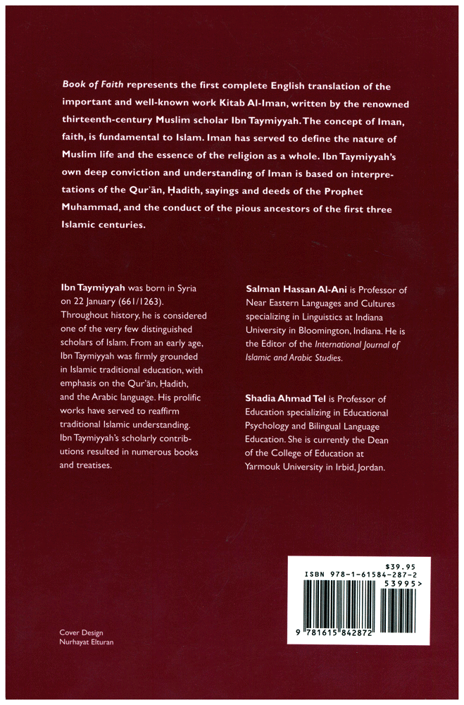 Book of Faith represents the first complete English translation of the important and well-known work Kitab Al-Iman, written by the renowned thirteenth-century Muslim scholar Ibn Taymiyyah. The concept of Iman, faith, is fundamental to Islam. Iman has served to define the nature of Muslim life and the essence of the religion as a whole. Ibn Taymiyyah’s own deep conviction and understanding of Iman is based on the interpretations of the Quran, Hadith, sayings and deeds of the Prophet Muhammad (pbuh), and the conduct of the pious ancestors of the first three Islamic countries. Ibn Taymiyyah was born in Syria on 22 January (661/1263). Throughout history, he is considered one of the very few distinguished scholars of Islam. From an early age, Ibn Taymiyyah was firmly grounded in Islamic traditional education, with emphasis on the Quran Hadith, and the Arabic language. His prolific works have served to reaffirm traditional Islamic understanding. Ibn Taymiyyah’s scholarly contributions resulted in numerous books and treaties.