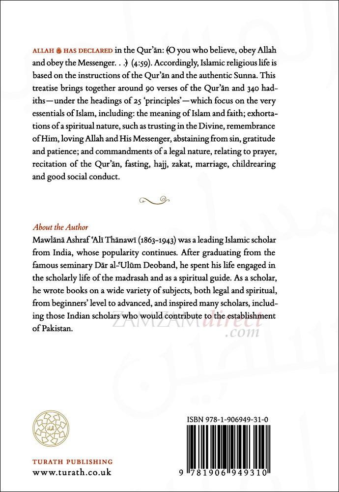 Allah (swt) has declared in the Qur’ān: ﴾O you who believe, obey Allah and obey the Messenger…﴿ (4:59). Accordingly, Islamic religious life is based on the instructions of the Qur’ān and the authentic Sunna. This treatise brings together around 90 verses of the Qur’ān and 340 hadiths—under the headings of 25 ‘principles’—which focus on the very essentials of Islam, including: the meaning of Islam and faith; exhortations of a spiritual nature, such as trusting in the Divine, remembrance of Him, loving Allah and His Messenger, abstaining from sin, gratitude and patience; and commandments of a legal nature, relating to prayer, recitation of the Qur’ān, fasting, hajj, zakat, marriage, childrearing and good social conduct.