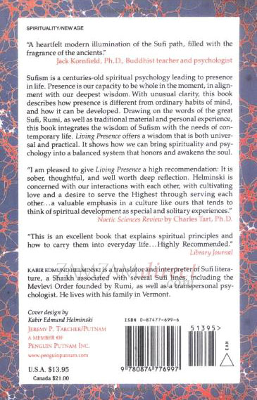 “I am pleased to give Living Presence a high recommendation: It is sober, thoughtful, and well worth deep reflection. Helminski is concerned with out interactions with each other, with cultivating love and a desire to serve the Highest through serving each other . . . a valuable emphasis in a culture like ours that tends to think of spiritual development as special and solitary experiences.”—Noetic Sciences Review by Charles Tart, Ph.D.