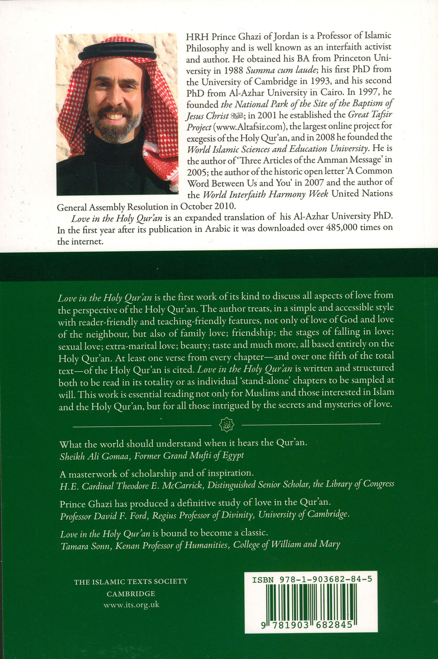 H.R.H. Prince Ghazi of Jordan is a Professor of Islamic Philosophy, and is well known as an interfaith activist and author. He obtained his BA from Princeton University in 1988 Summa cum laude, his first PhD from Cambridge University, UK, in 1993, and his second PhD from Al-Azhar University in Cairo. In 1997 he founded the National Park of the Site of the Baptism of Jesus Christ. In 2001 he established the Great Tafsir Project, the largest online project for exegesis of the Holy Qur’an, and in 2008 he founded the World Islamic Sciences and Education University. He is the author of ‘Three Articles of the Amman Message’ in 2005; the author of the historic open letter ‘A Common Word Between Us and You’ in 2007, and the author of the World Interfaith Harmony Week United Nations General Assembly Resolution in October 2010. Love in the Holy Qur’an is a translation of (the expanded 7th edition of) his Al-Azhar University PhD thesis.