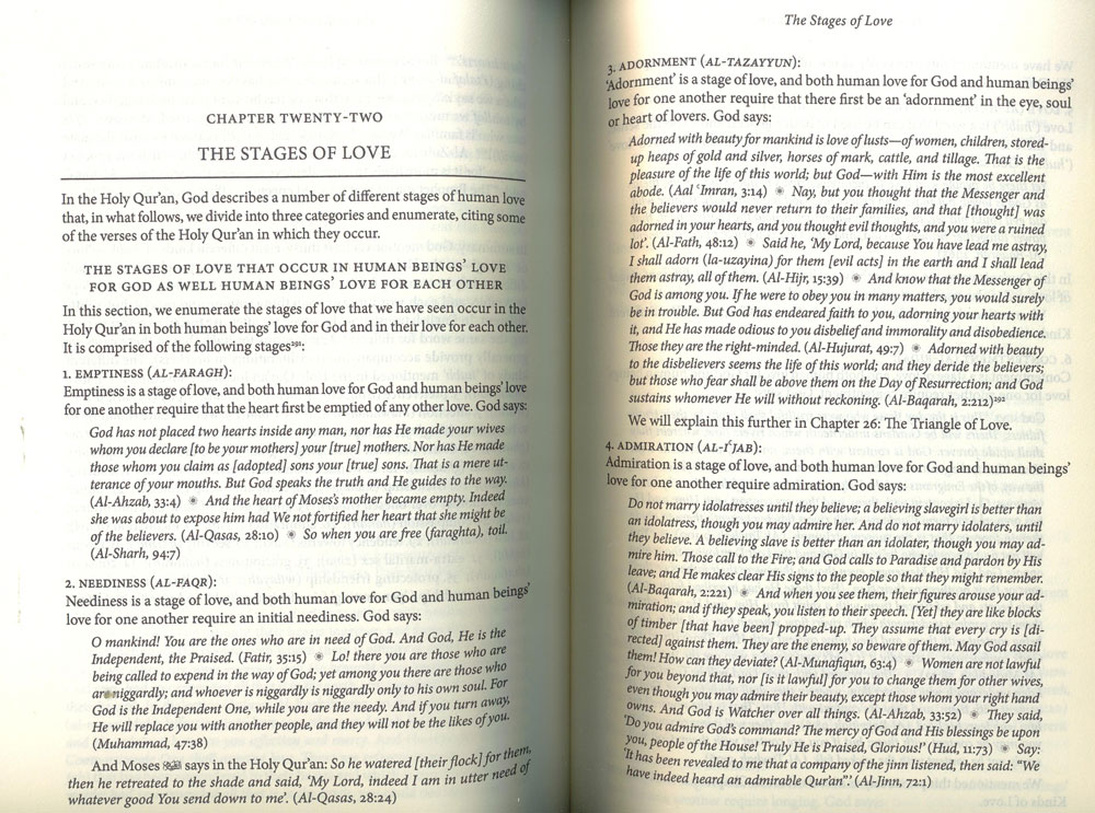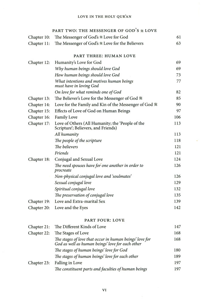 The author treats, in a simple and accessible style with reader-friendly and teaching-friendly features, not only of love of God and love of the neighbour, but also of family love; friendship; the stages of falling in love; sexual love; extra-marital love; beauty; taste and much more, all based entirely on the Holy Quran. At least one verse from every chapter and over one fifth of the total text of the Holy Qur an is cited. It is written and structured both to be read in its totality or as individual stand-alone chapters to be sampled at will. This work is thus essential reading not only for Muslims and those interested in Islam and the Holy Quran, but for all those interested in the secrets and mysteries of love as such.