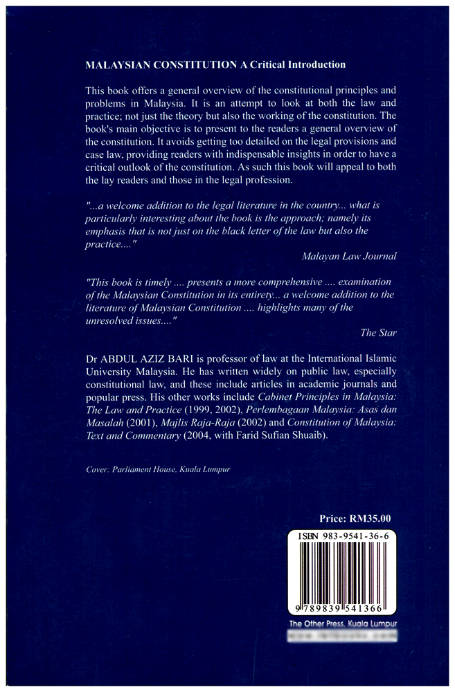 Author: Abdul Aziz Bari Publisher: The Other Press - TOP Size/Vol.: A5_EXTRA (17.3x23.5 cm - 6.81x9.25 in) ISBN : 9839541366 Language : English -A5 Size (Large) - 23 x 15 x 1.8 CMBinding : Paperback -