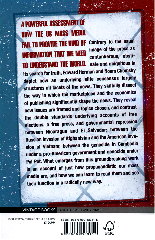 Contrary to the usual image of the press as cantankerous, obstinate, and ubiquitous in its search for truth, Edward Herman and Noam Chomsky depict how an underlying elite consensus largely structures all facets of the news. They skilfully dissect the way in which the marketplace and the economics of publishing significantly shape the news. They reveal how issues are framed and topics chosen, and contrast the double standards underlying accounts of free elections, a free press, and governmental repression between Nicaragua and El Salvador; between the Russian invasion of Afghanistan and the American invasion of Vietnam; between the genocide in Cambodia under a pro-American government and genocide under Pol Pot. What emerges from this groundbreaking work is an account of just how propagandistic our mass media are, and how we can learn to read them and see their function in a radically new way.