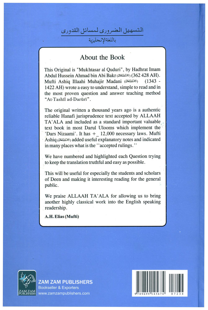 Mufti Ashiq Ilahi's simple and lucid commentary of Mukhtasar al-Quduri in question and answer format, rendered into English. This commentary also includes explanatory notes where the author considered it necessary.