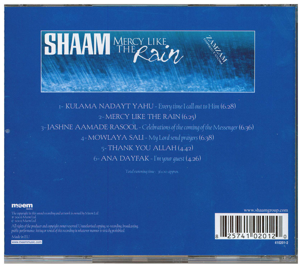 Artist: 22_Shaam Producer: Meem Music Language : Arabic, English, Urdu -This album was the first international release of the UK's most famous nasheed group SHAAM and went onto become one of the best selling nasheed albums of all time. Critically acclaimed, the album includes the delightful 'Mercy like the Rain' together with crowd favourites 'Jashne Aamede Rasool' and 'Kulama Nadayt Yahu'. It also features the profound 'Mowlaya Sali' which is derived from the Qasidah Burdah of Imam al-Busiri and performed in the Damascene style.