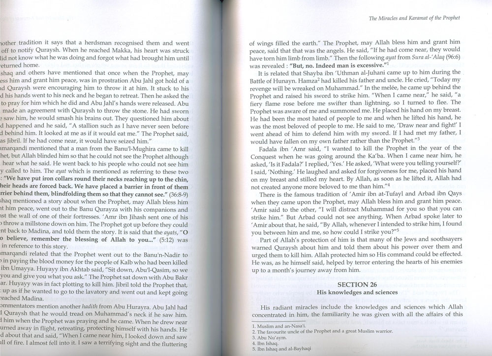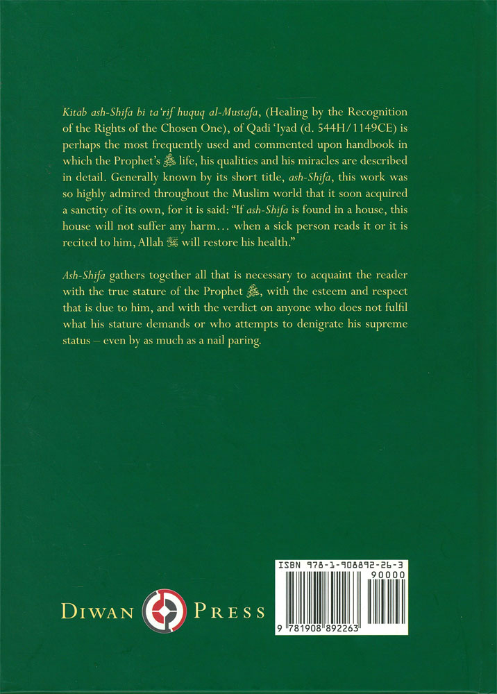 Kitab Ash-shifa bi tarif huqub al-Mustafa, (Healing by the recognition of the Rights of the Chosen One), of Qadi Iyad is perhaps the most frequently used and most commented upon handbook in which the Prophets life, his qualities and miracles are described in every detail. This book is highly admired throughout the Muslim world and is quick to acquaint the reader with the true stature of the Prophet saw. -