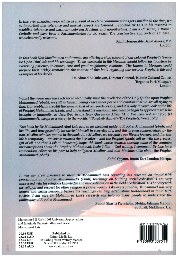 Based on the perceptions of non-Muslims, the book uncovers the truth about the Prophet Muhammad (SAW), clarifies the reasons for misunderstanding between Islam and the West and highlights the prophetic teachings which help to build unity and peace amongst interfaith communities. Data was collected by reviewing appreciations of Muhammad (SAW) made by non-Muslims across the history and also conducting semi-structured interviews involving contemporary non-Muslim prominent personalities including MPs, Lords, and priests from interfaith communities and chaplaincies of some leading universities. The combination of qualitative and quantitative approaches has contributed in revealing the reality and establishing interfaith understanding.