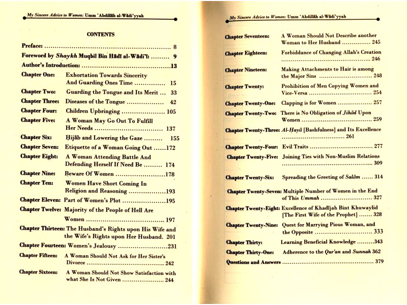 This book contains sincere advice to the women, it is followed by questions and answers that were presented to the women and which they undertook the task of answering. I have chosen from one of their responses to be added to the advice to women.