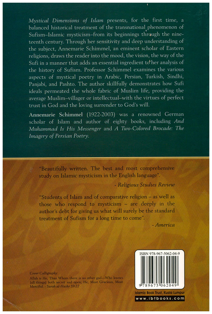 "This book presents, for the first time, a balanced historical treatment of the transnational phenomenon of Sufism?Islamic mysticism?from its beginnings through the nineteenth century. Through her sensitivity and deep understanding of the subject, Annemarie Schimmel, an eminent scholar of Eastern religions, draws the reader into the mood, the vision, the way of the Sufi in a manner that adds an essential ingredient to her analysis of the history of Sufism. Professor Schimmel examines the various aspects of mystical poetry in Arabic, Persian, Turkish, Sindhi, Panjabi, and Pashto. The author skillfully demonstrates how Sufi ideals permeated the whole fabric of Muslim life, providing the average Muslim?villager or intellectual?with the virtues of perfect trust in God and the loving surrender to God?s will."