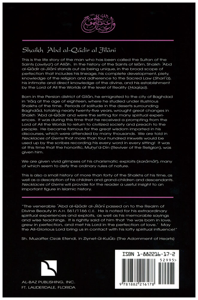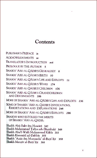 This is the life story of the man who has been called the Sultan of the Saints (awliya') of Allah. In the history of the Saints of Islam, Shaikh 'Abd al-Qadir stands out as being unique, in the broad scope of perfection that includes his lineage, his complete development, piety, knowledge of the religion and adherence to the Sacred Law (Shari'a), his intimate and direct knowledge of the Divine, and his establishment by the Lord of All the Worlds at the level of Reality (Haqiqa). In this extensive biography we are given vivid glimpses of his charismatic exploits (karamat), many of which seem to defy the ordinary rules of nature. The book is also a small history of more than forty of the Shaikhs of his time, his companions of that day and age, as well as a description of his children, grandchildren and descendants.